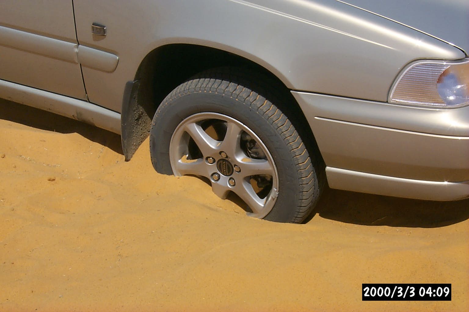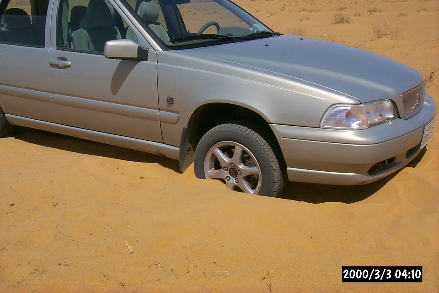 Nyt alkaa käydä kiinnostavaksi. MOLEMMAT autot kiinni hiekassa. Onneksi